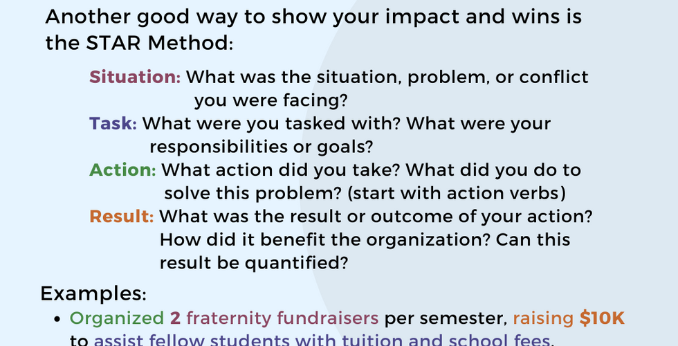 Your resume is an opportunity to show your impact and accomplishments! A good way to do that with is the XYZ Method: